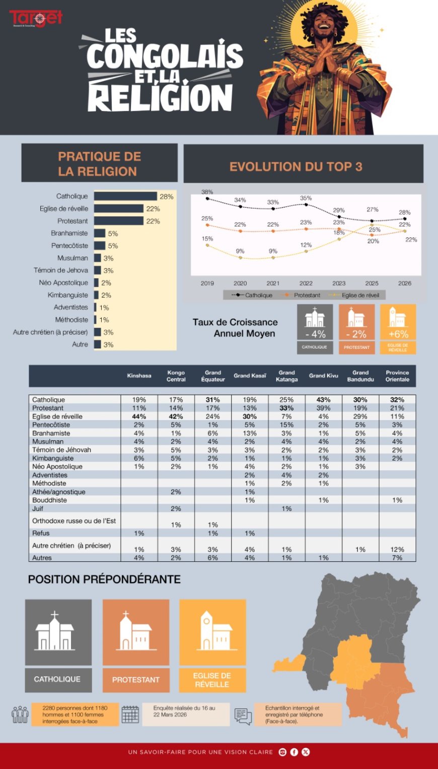 L’Église Catholique demeure la principale confession chrétienne en République démocratique du Congo, avec 28 % des fidèles, suivie des Églises de réveil et de l'Église protestante, qui rassemblent chacune 22 % des croyants. C’est ce que révèle une enquête intitulée « Les Congolais et la religion », réalisée en mars 2026 par le cabinet Target Sarl.