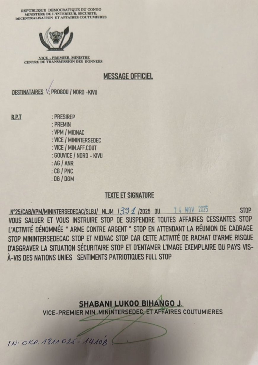 Le vice-premier ministre chargé de l'Intérieur, Jacquemain Shabani, a ordonné la suspension de l'opération "armes contre argent" lancée par le gouverneur du Nord-Kivu, le général-major Evariste Somo Kakule.
